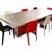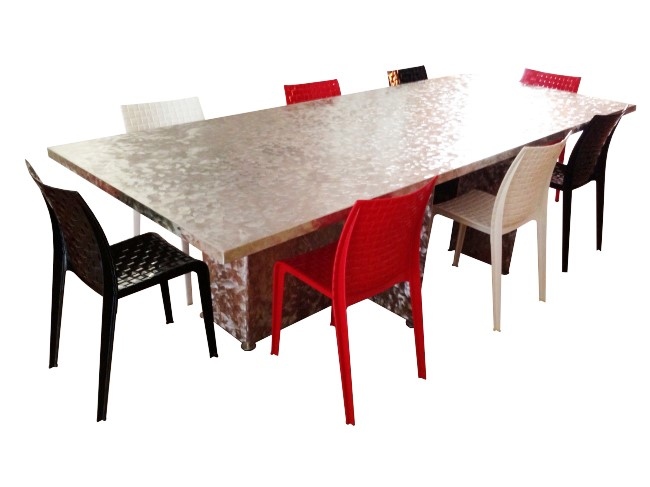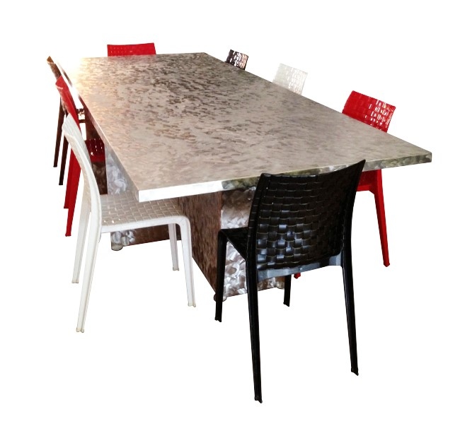 Table à manger inox avec effets de meulage sur la totalité des surfaces.